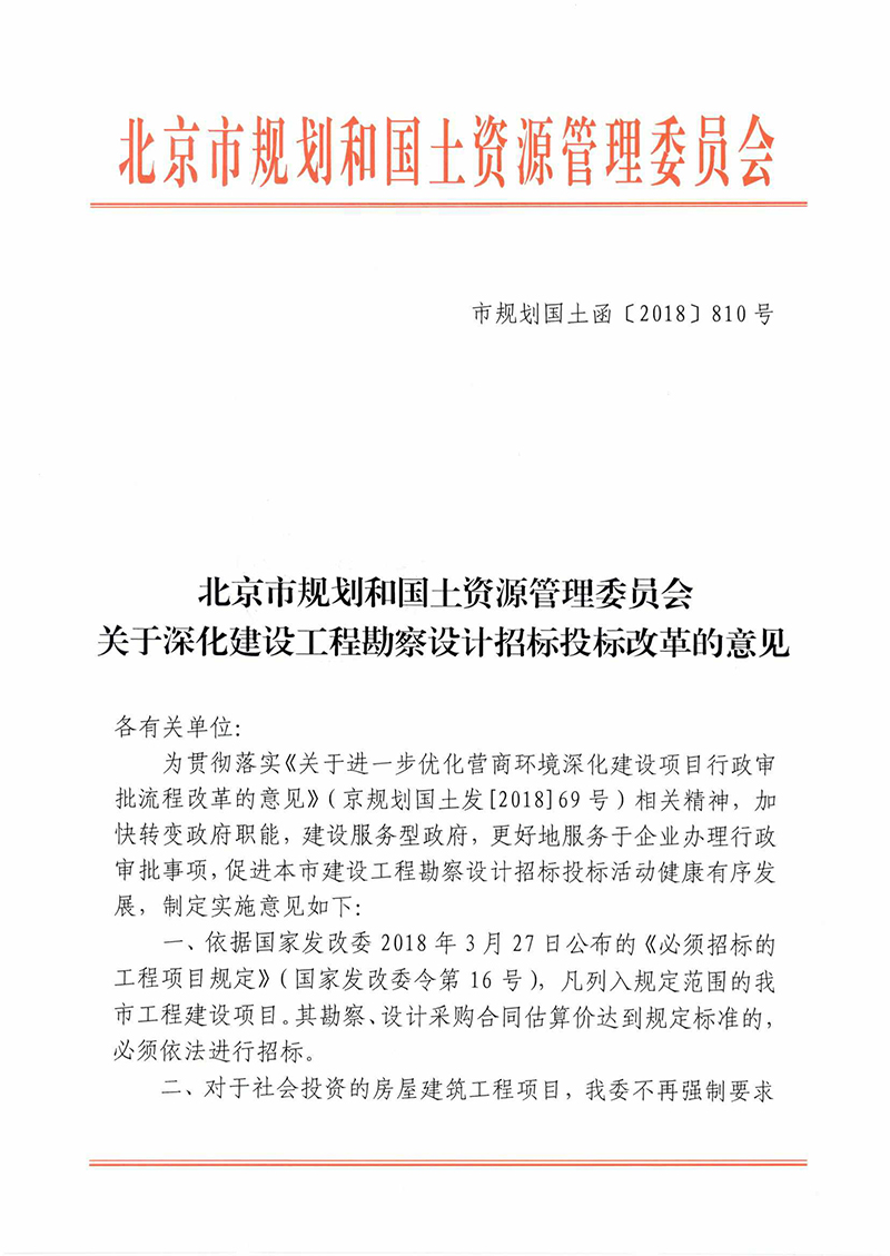 为落实《关于进一步优化营商环境深化建设项目行政审批流程改革的意见》(京规划国土发[2018]69号)相关精神,加快转变政府职能,建设服务型政府,切实减轻企业负担,更好地服务于企业办理行政审批事项,市规划国土委于近日下发《关于深化建设工程勘察设计招标投标改革的意见》(京规划国土函[2018]810号),明确对于社会投资的房屋建筑工程项目不再强制要求进行勘察、设计招投标,同时在办理建设工程规划许可时,不再要求建设单位出具勘察设计招标投标备案文件;2018年4月1日起,对于新开展招标工作的,不再收取建设工程勘察设计招投标交易服务费,估算每年将减少收费约1000万元。