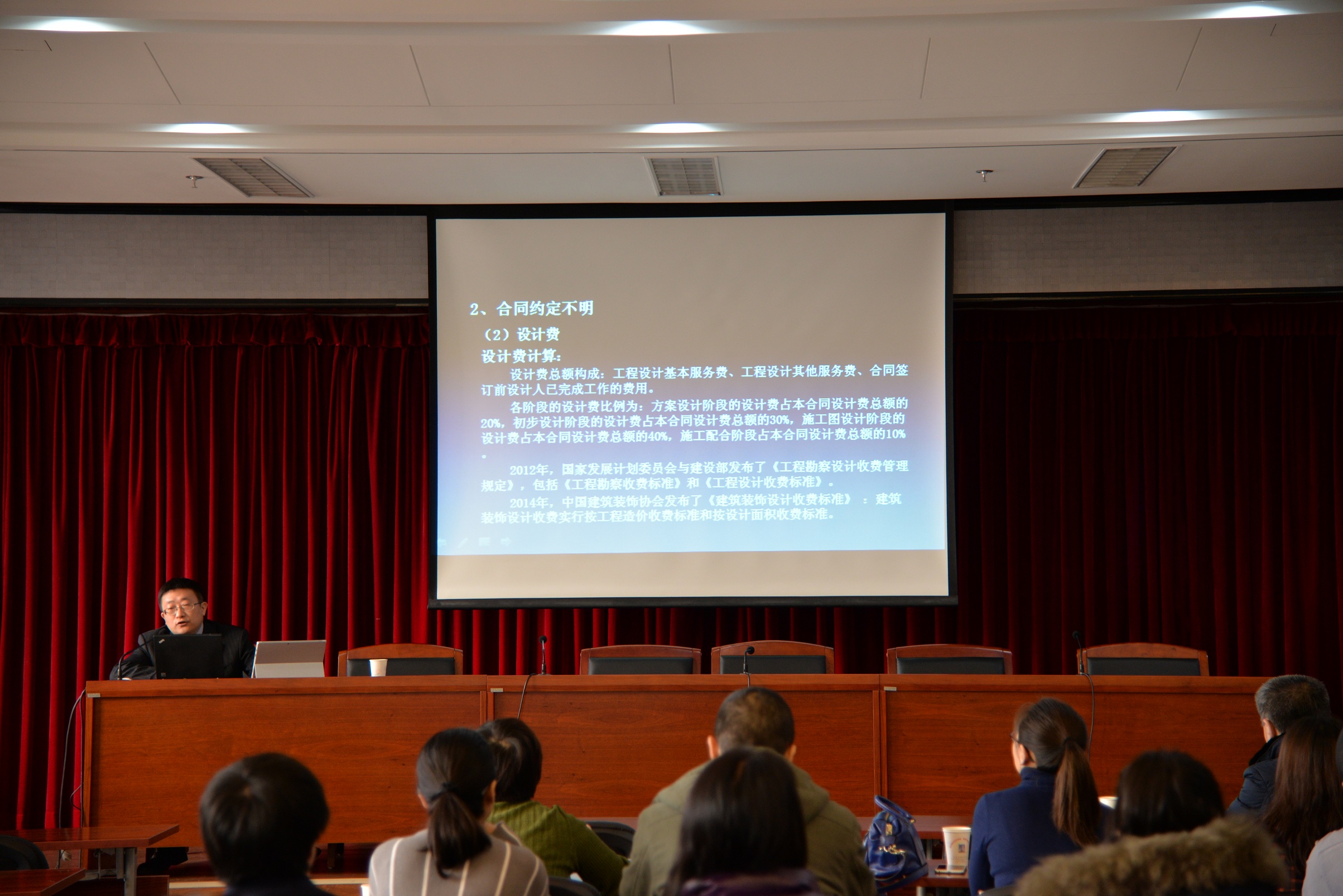 讲座围绕“建设工程设计合同法律风险的防范与对策”及“员工离职的预防与应对”两大主题展开,北京市盈科律师事务所的梁峰律师、于莹莹律师用详实的法律规定、生动的案例对涉及到的问题予以详细讲解。参会人员对讲座内容予以肯定。