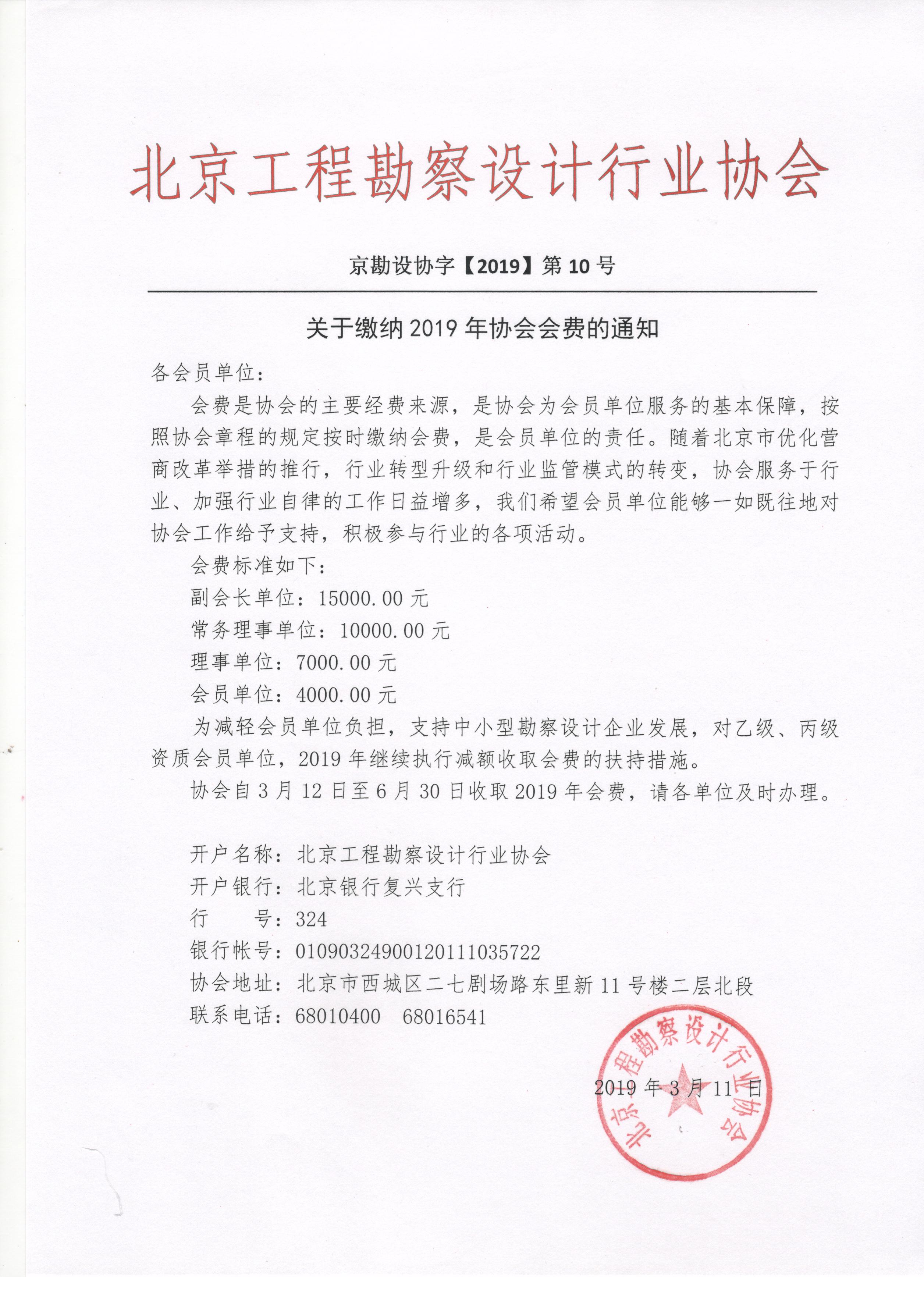 为减轻会员单位负担,支持中小型勘察设计企业发展,对乙级、丙级资质会员单位,2019年继续执行减额收取会费的扶持措施。