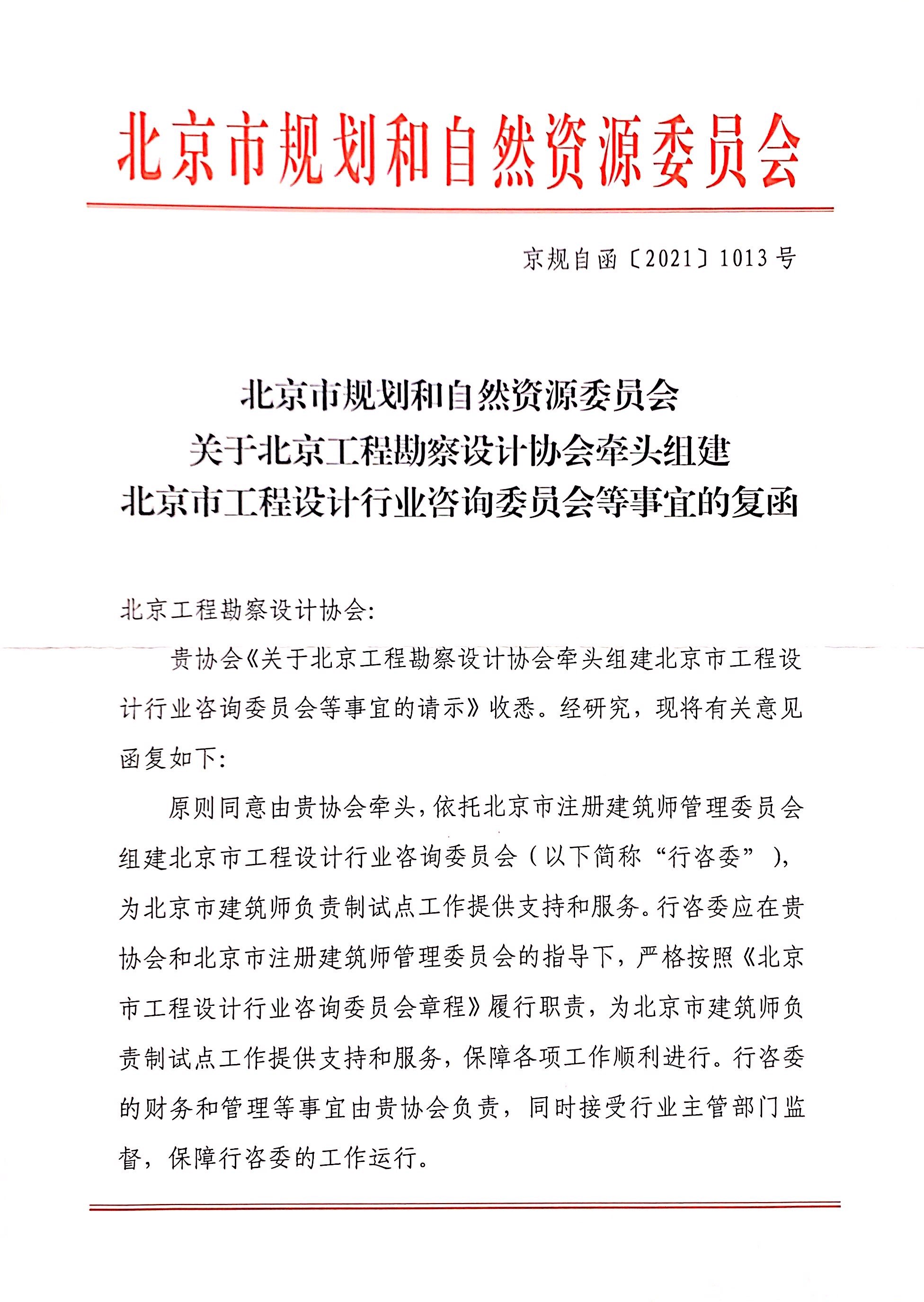关于北京市规划和自然资源委员会批准88爱彩网牵头组建北京市工程设计行业咨询委员会的复函