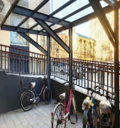 图4 改造前现状(左)室外充电停车棚现场照片(中)无障碍人性化坡道现场照片(右)