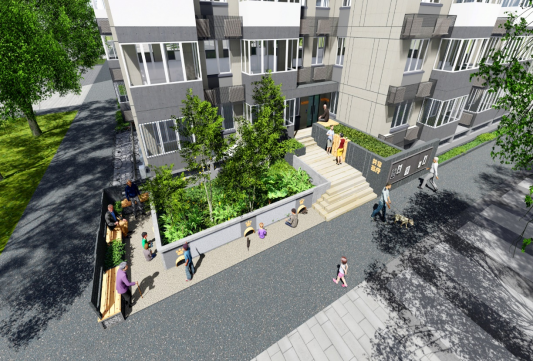 一是电瓶车不进楼等安全防护,出于“电动车不进楼”的安全性考量,专门为骑电动车的居民设置了室外充电停车位,并对无障碍坡道进行了人性化改造,保证老年人出行安全;二是打造楼栋“共享客厅”,在楼栋南入口处设置全楼栋居民共同的客厅,并结合场地环境设计了便民服务信息栏,满足居民邻里交往和方便居民生活;三是老幼同欢人宠共存,创造老幼同乐的阳光乐享生活场景,结合原有花池设置了集儿童填色墙绘、流浪猫舍、渗水构造和太阳能灯带于一体的集成花池墙,增强交互性,扩大空间感,并为流浪小动物提供一个家。